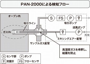 このたび開発した「食品オーブン用ガス警報器 PAN-2000」は、当社独自の検知技術により、結露を発生させずにオーブン内のガス濃度を検知します。オーブン内の高温高湿ガスを、炉内へ挿入した配管内で外気と混合希釈させ、ガスの湿度を下げることで配管内結露の発生を大幅に低減させます。これにより、配管などの腐食を防止できるほか、センサ故障を大幅に減少することができます。さらに、配管やフィルタの目詰まりによる吸引流量の低下も少なくなります。水封の管理やフィルタ交換などの管理の手間も低減するため、ランニングコストのカットにもつながります。