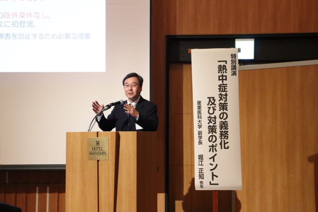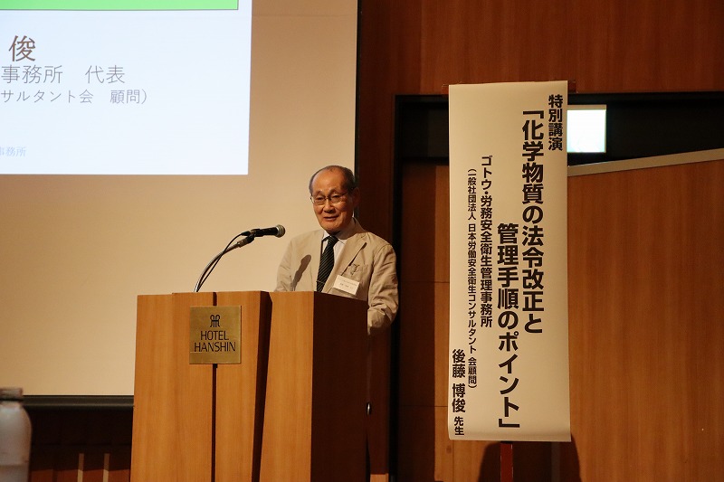 当日は、ゴトウ・労務安全衛生管理事務所の後藤博俊様より化学物質に関する法令改正について、また産業医科大学副学長の堀江正知様より熱中症対策の法令改正についてをご講演いただきました。
