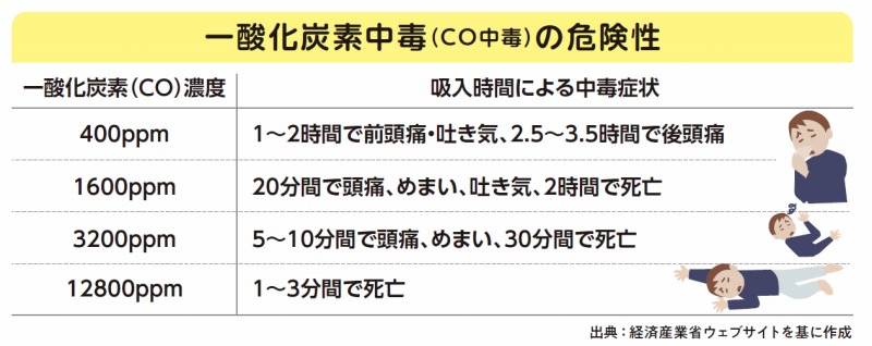 一酸化炭素は「無色・無臭」で人の五感では発生に気づくことができない上、人体に非常に有毒で“サイレントキラー(静かな殺し屋)”とも呼ばれます。体内へ酸素を運ぶ役割を担う血液中のヘモグロビンと非常に結びつきやすく、酸素の運搬を妨げ、頭痛・めまい・吐き気・意識障害を引き起こし、最悪の場合死に至る可能性があります。