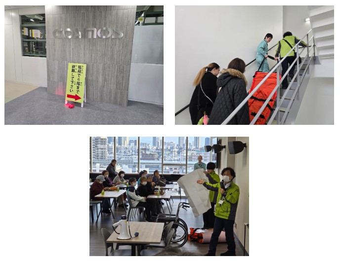 | 主な訓練内容 | ・津波避難ビルへの避難誘導・避難場所(6階)への避難 ・淀川区役所、ALSOK株式会社(警備会社)による講評 ・大阪市淀川区社会福祉協議会よりエアーストレッチャーの紹介 |