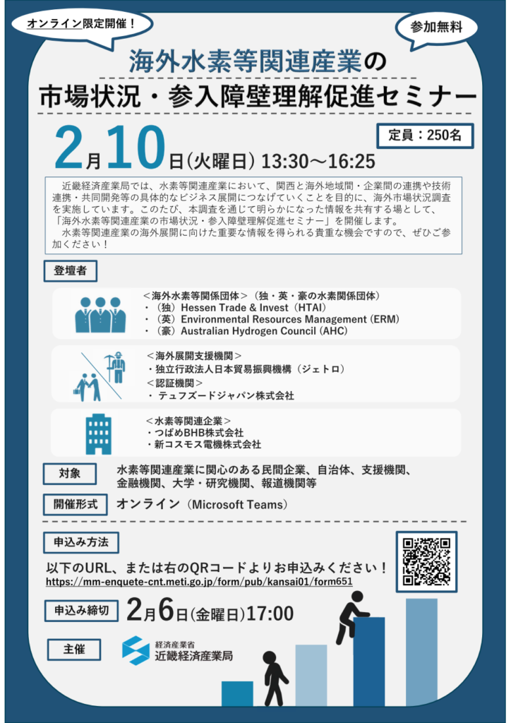 本セミナーは、水素等関連産業における関西と海外地域間・企業間の連携や技術連携・共同開発等の具体的なビジネス展開につなげていくことを目的に実施している海外市場状況調査を通じて明らかになった最新情報を共有する場として開催されます。