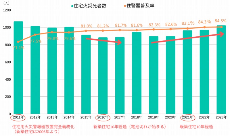 その要因の一つとして、住宅用火災警報器の交換が進んでおらず、多くの家庭で電池が切れた火災警報器がそのまま設置されていることが危惧されています。