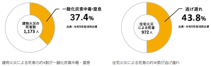 また、建物火災による死者の約4割が一酸化炭素中毒・窒息によるもので、住宅火災による死者の約半数が逃げ遅れによるものです。