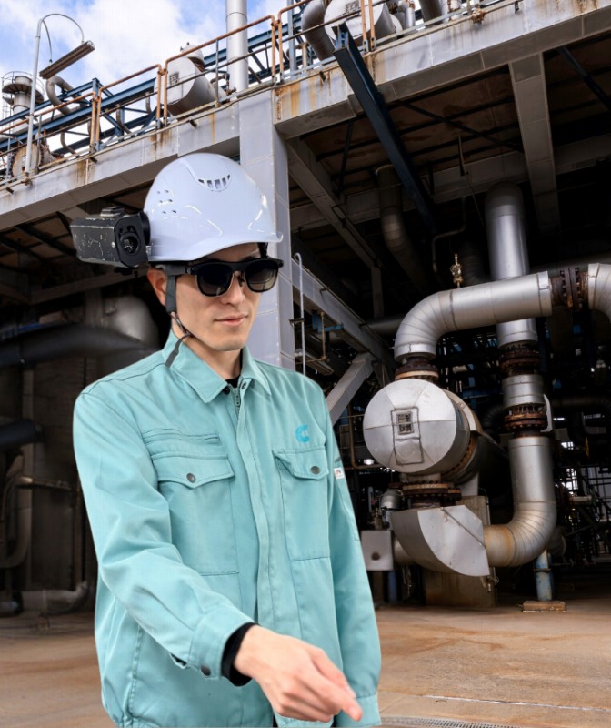 - 検査者はレーザー式ガス検知器付きヘルメットを装着します。あらかじめレーザーの照射方向と視線を合わせることで、検査者はハンズフリーで検査対象の方向に視線を向けるだけでガス漏洩検査ができます。これにより、従来は熟練検査者の経験に依存していたガス漏洩の把握を、より直感的かつ再現性のある形で行うことが可能になります。