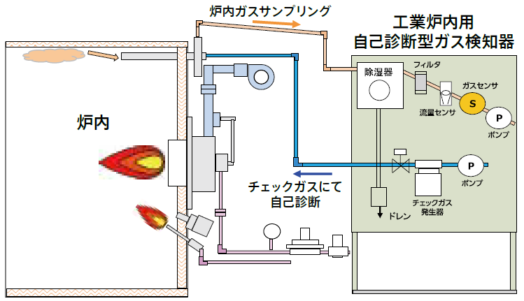 チェックガス発生器からチェックガスをガス配管に流し、流量のチェックとセンサの出力を自動で自己診断 - 点火前にガス検知器をONにし、炉内の未燃ガスを有無を確認
